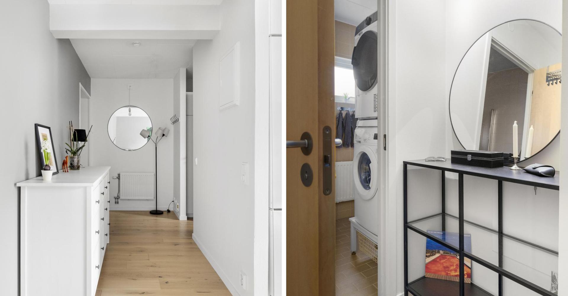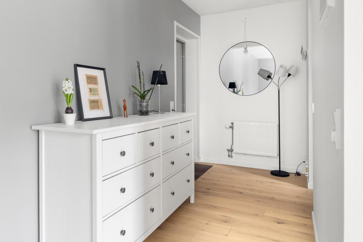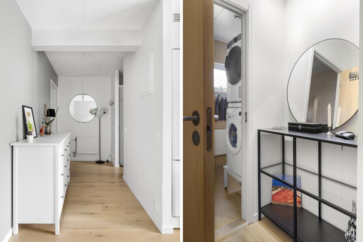 Hall med parkettgolv -20, målade väggar -25 samt 2 st garderober.