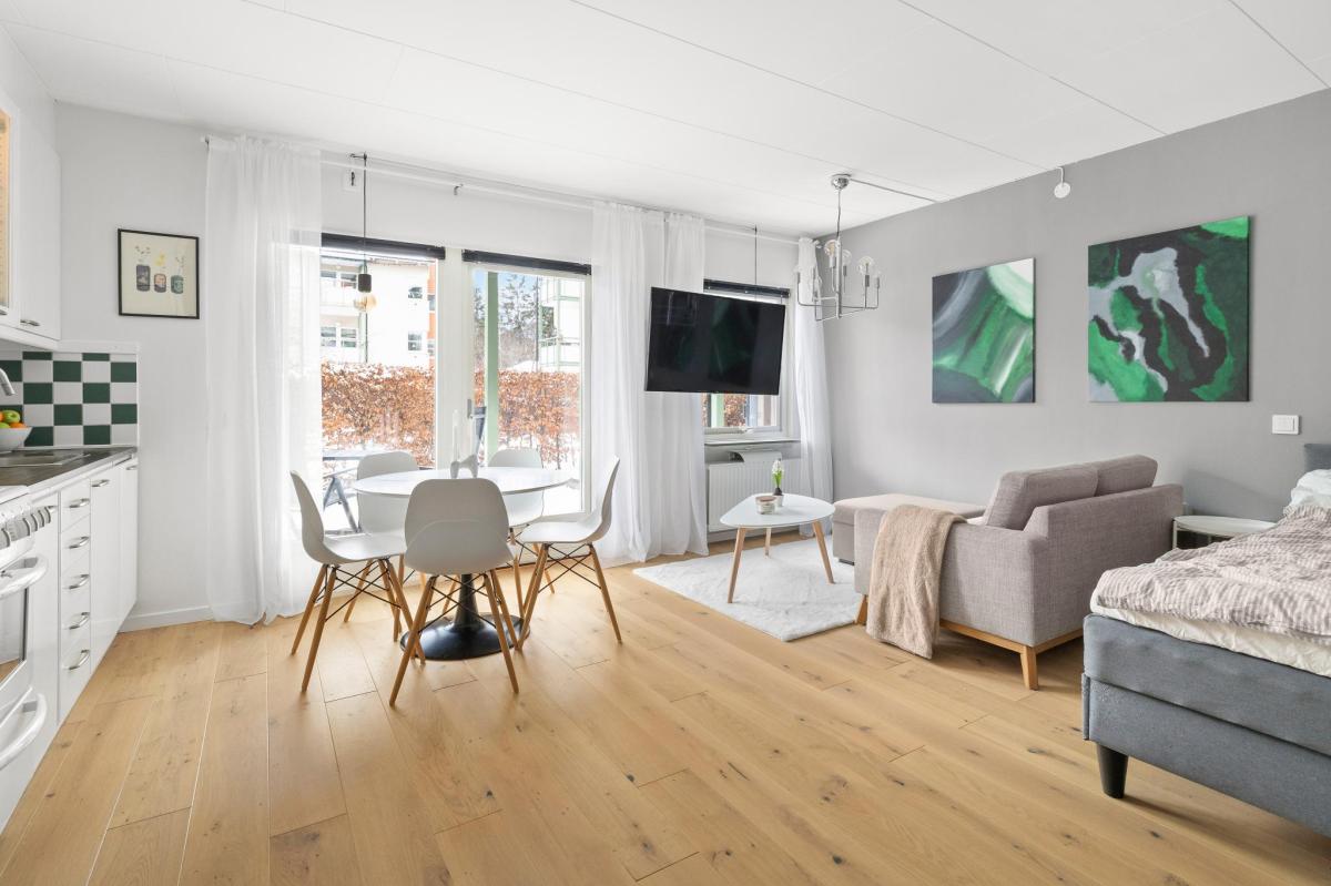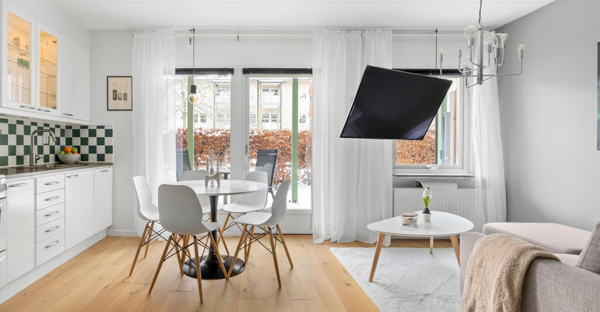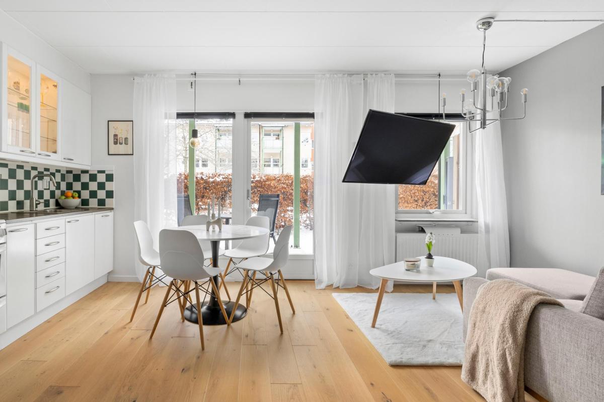 Vardagsrum med parkettgolv -20. målade väggar -25 samt utgång till uteplats.
