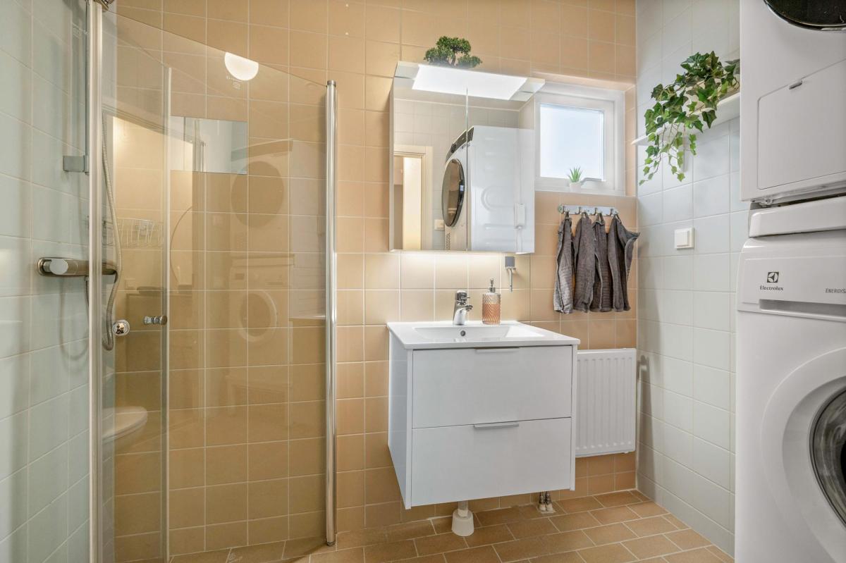 Badrum med fönster, tvättmaskin och tumlare