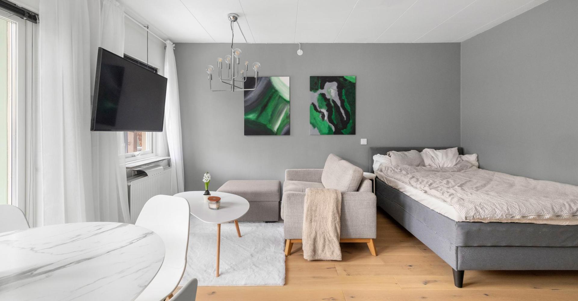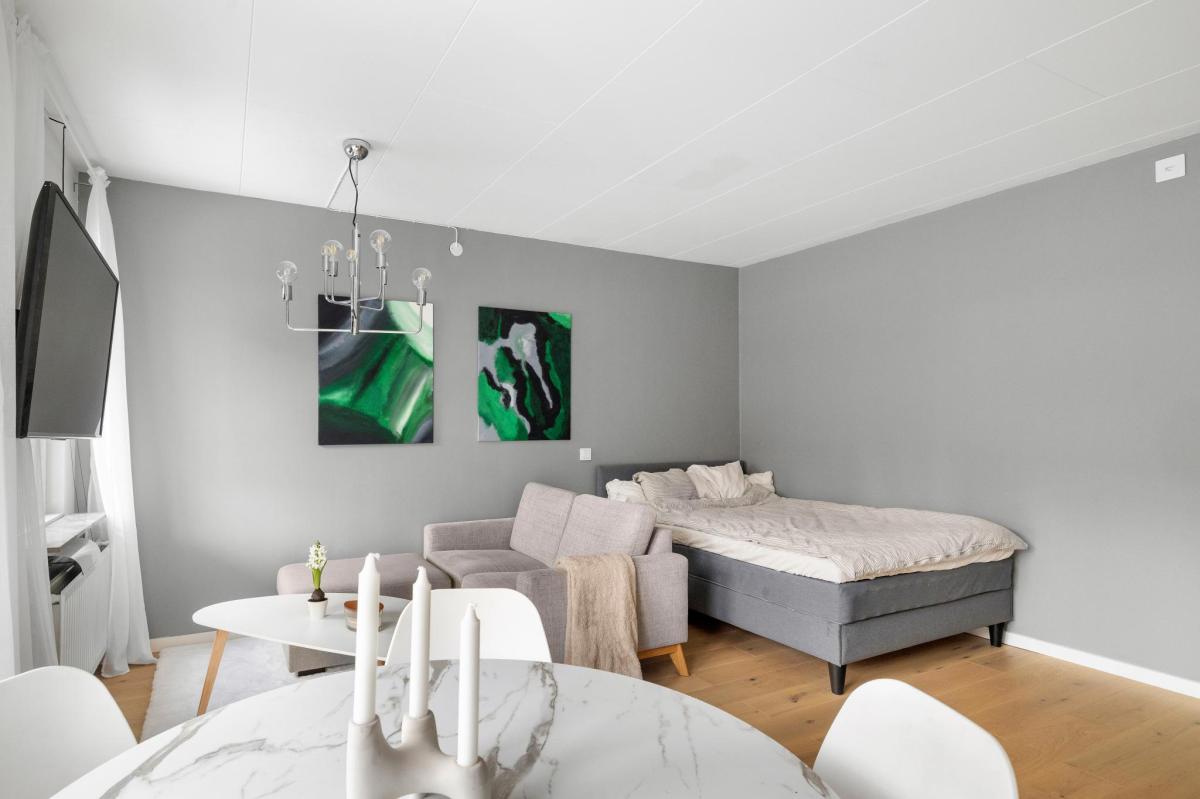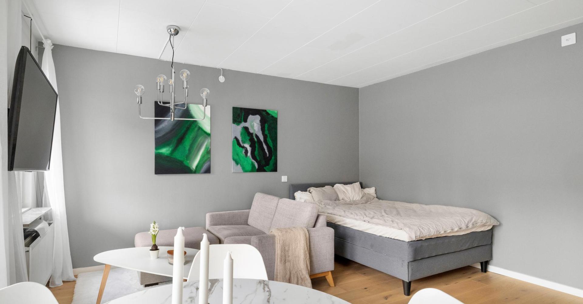 Praktiskt rum med plats för både säng och soffa