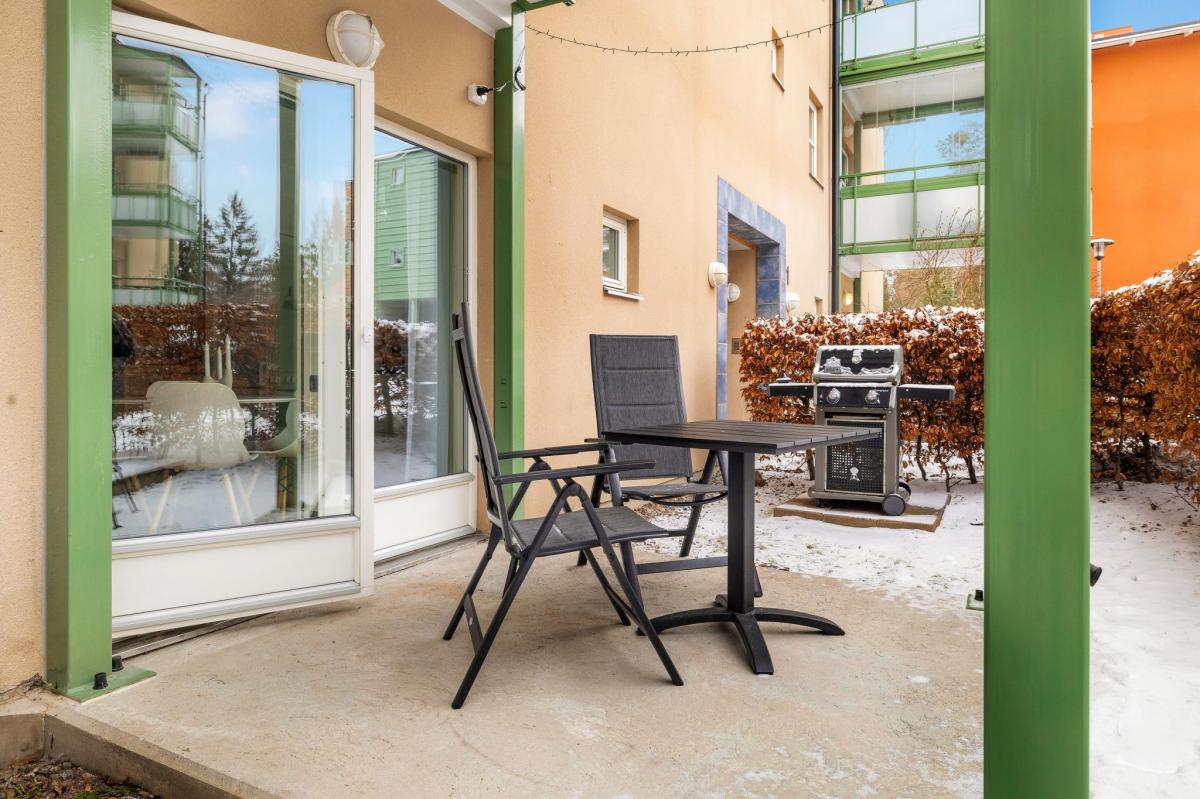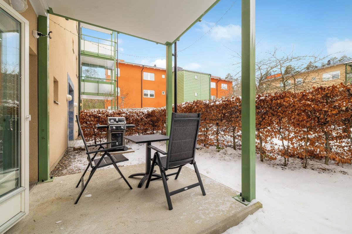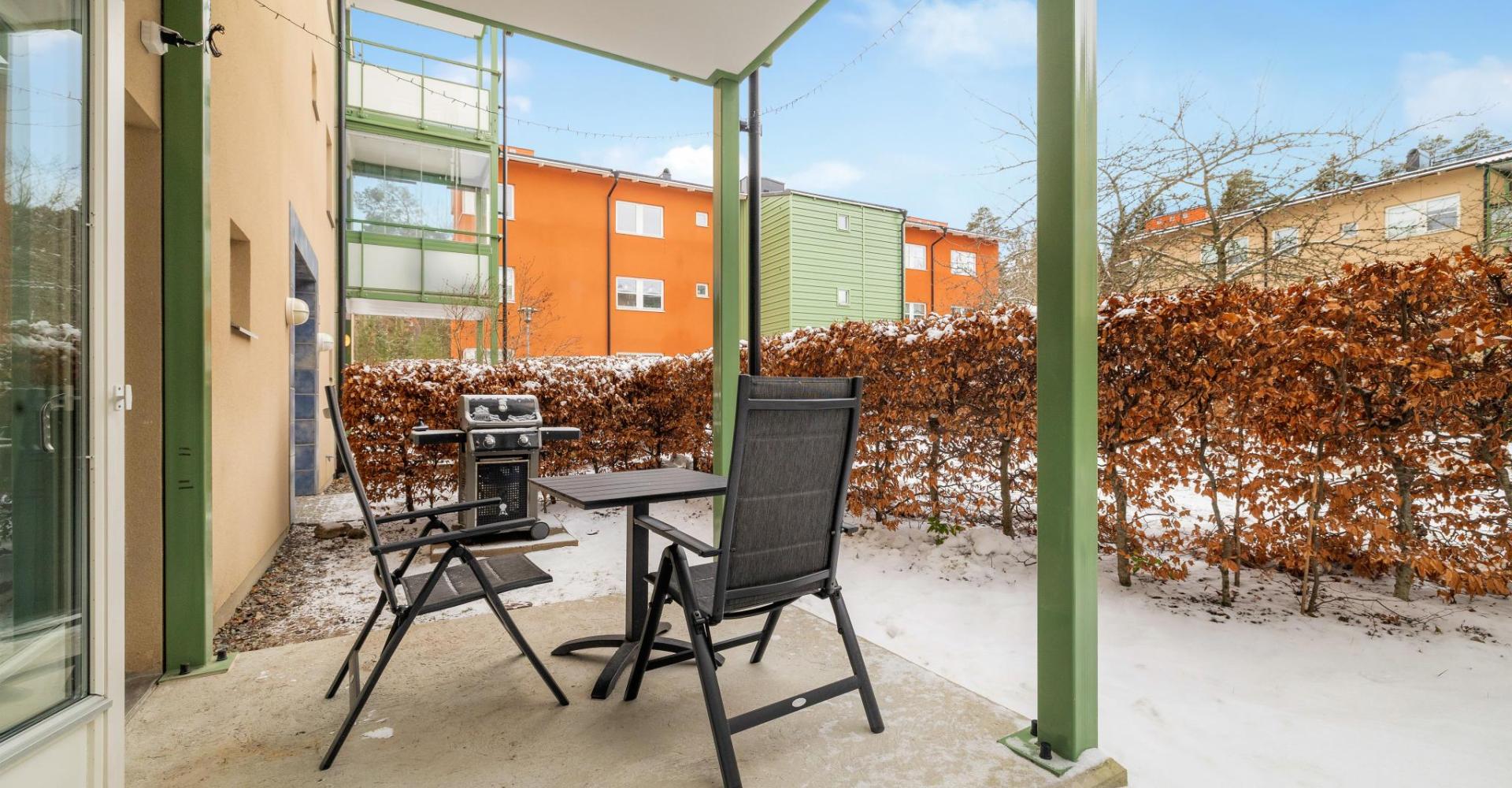 Lägenheten ligger insynsskyddat bakom häck